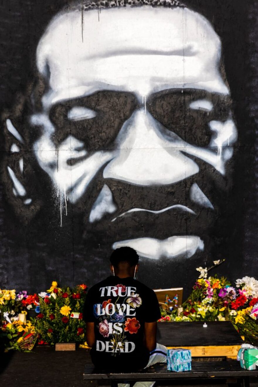 A man sits on a bench in front of Peyton Scott Russell’s George Floyd mural at George Floyd Square in Minneapolis. Photo by Kerem Yucel/AFP/AFP via Getty Images