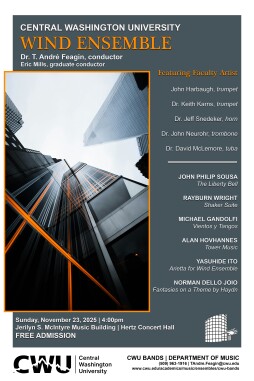 Under the direction of Dr. T. André Feagin, director of bands and associate professor of music, the Wind Ensemble will present a vibrant program featuring works by John Philip Sousa, Yasuhide Ito, Michael Gandolfi, and Norman Dello Joio. A highlight of the concert will be a special collaboration with members of CWU’s distinguished brass faculty in a performance of Rayburn Wright’s Shaker Suite. Featured artists include:
