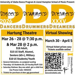 Dancers Drummers Dreamers is a student led showcase of Dance and Music from the University of Idaho. Please join us at the Hartung Theatre March 26 - March 28 @ 7:30 pm and March 28 @ 2 pm.