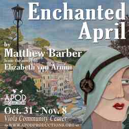 Enchanted April, the Tony Award nominated play by Matthew Barber and based on the book by Elizabeth von Arnim. Directed by Todd K. Payne. There will be 8 performances: Oct 31, Nov 1, 6, 7, & 8 at 7pm and Nov 1, 2, & 8 at 1:30pm.