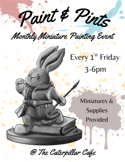 Join us for a miniature painting event, hosted by Doug Staudt. Miniatures and supplies will be provided. This will be a monthly event on every 1st Friday.