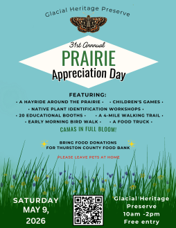 Visit Glacial Heritage Preserve, open to the public just this one day of the year. It is a restored prairie that may now look much the way it was when Lewis and Clark arrived in the west. Once prairies were a predominate ecosystem stretching from British Columbia to California. Now about 3% of prairie habitat remains. On the 1,000 acre Preserve you can see a vast array of the plants and animals that are found on prairies. The celebration features a hayride, children's games, native plant identification workshops, educational booths, a 4 mile walking trail, early morning bird walk (weather permitting, up to 70 species of birds can be sighted).