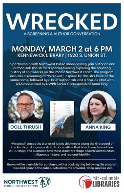 In this dynamic community event the audience will be treated to: A screening of the NWPB documentary “Wrecked,” an author presentation by Coll Thrush the author of the new book by the same name, and a fireside chat between NWPB's Anna King and Thrush. The entire program will be about an hour, with an optional book signing event immediately afterwards.