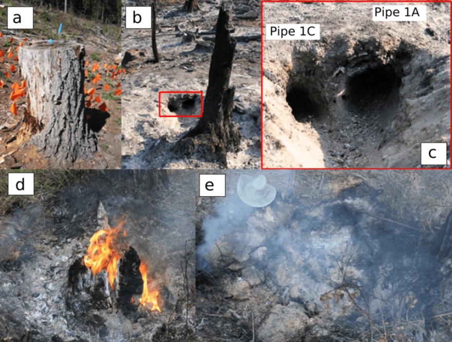 “There is enough oxygen,” says University of Idaho Professor of Forest Resources Alistair Smith. “They don’t need much continuous air to sustain smoldering combustion. It helps that the burned out roots essentially form chimneys that enable some degree of air circulation.”