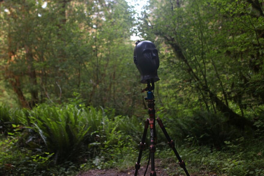 The head is actually an unusual microphone — which Mikkelsen lovingly refers to as "Fritz" — and he is using it to record the dawn chorus, the time when the forest wakes, and the chirps and hiccups of the night give way to the trilling, ecstatic reveille of the rain forest's birds. (To fully experience what this sounds like, listen to the audio version of this story — available above — using earbuds.)
